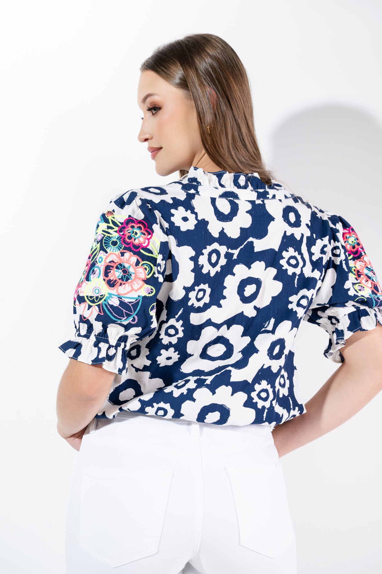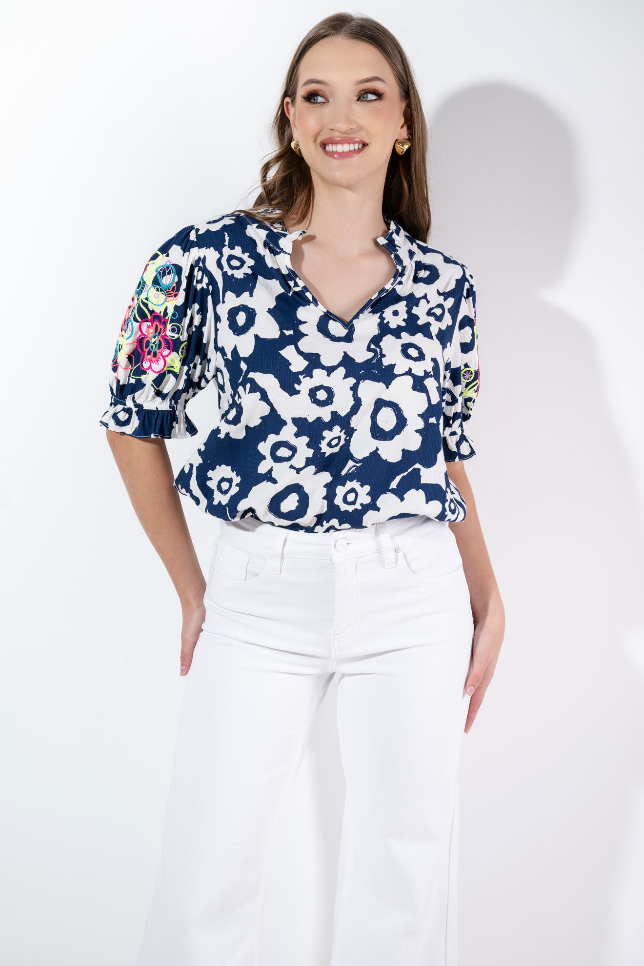 Blusa En Rayon Estampado, Mangas Bordadas