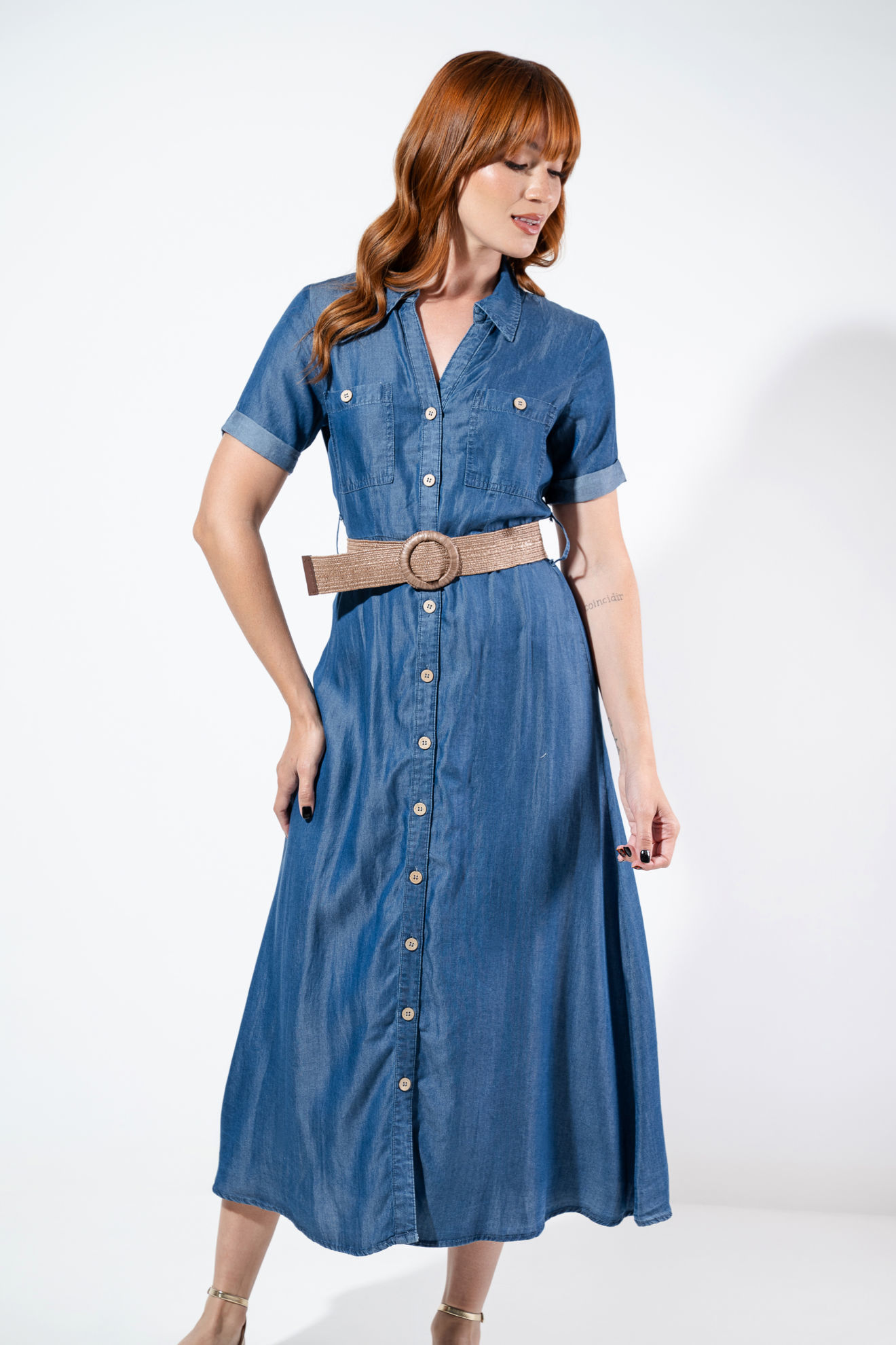 Vestido Camisero Con Cinturon En Denim