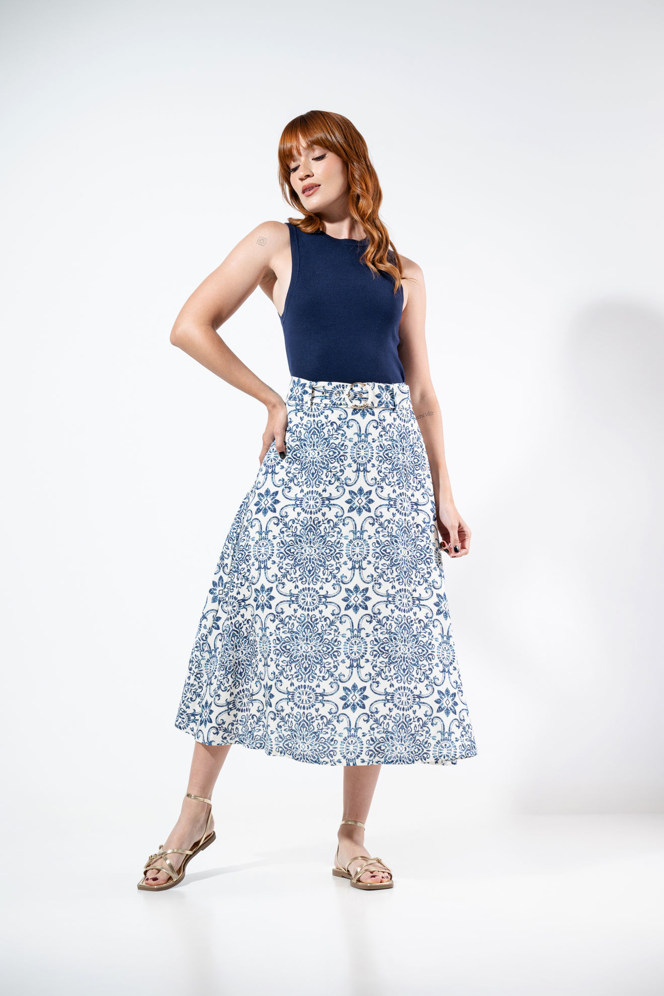 Falda Estampada Linea A Con Cinturon