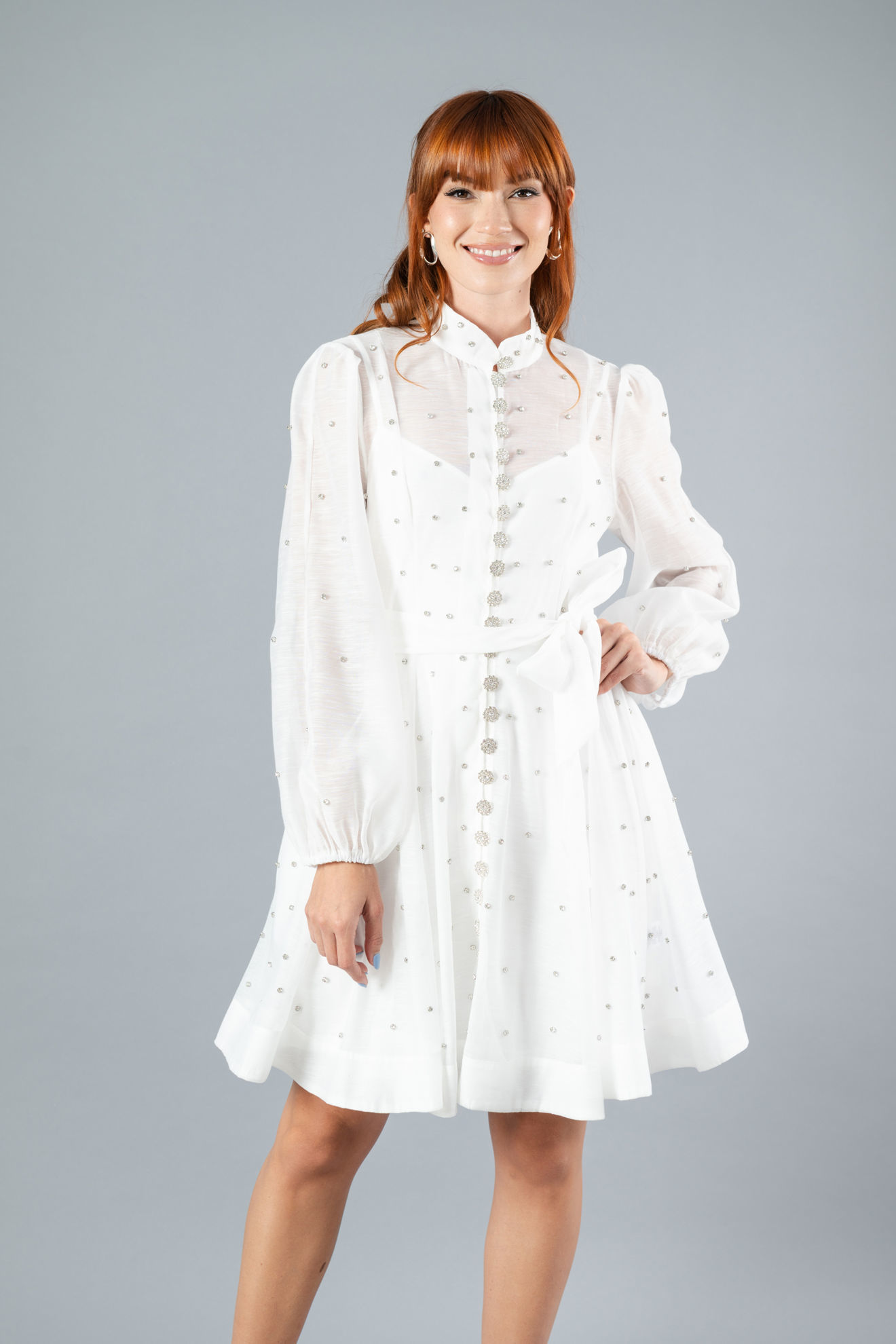 Vestido Manga Larga Cuello Alto, Botones Decorados