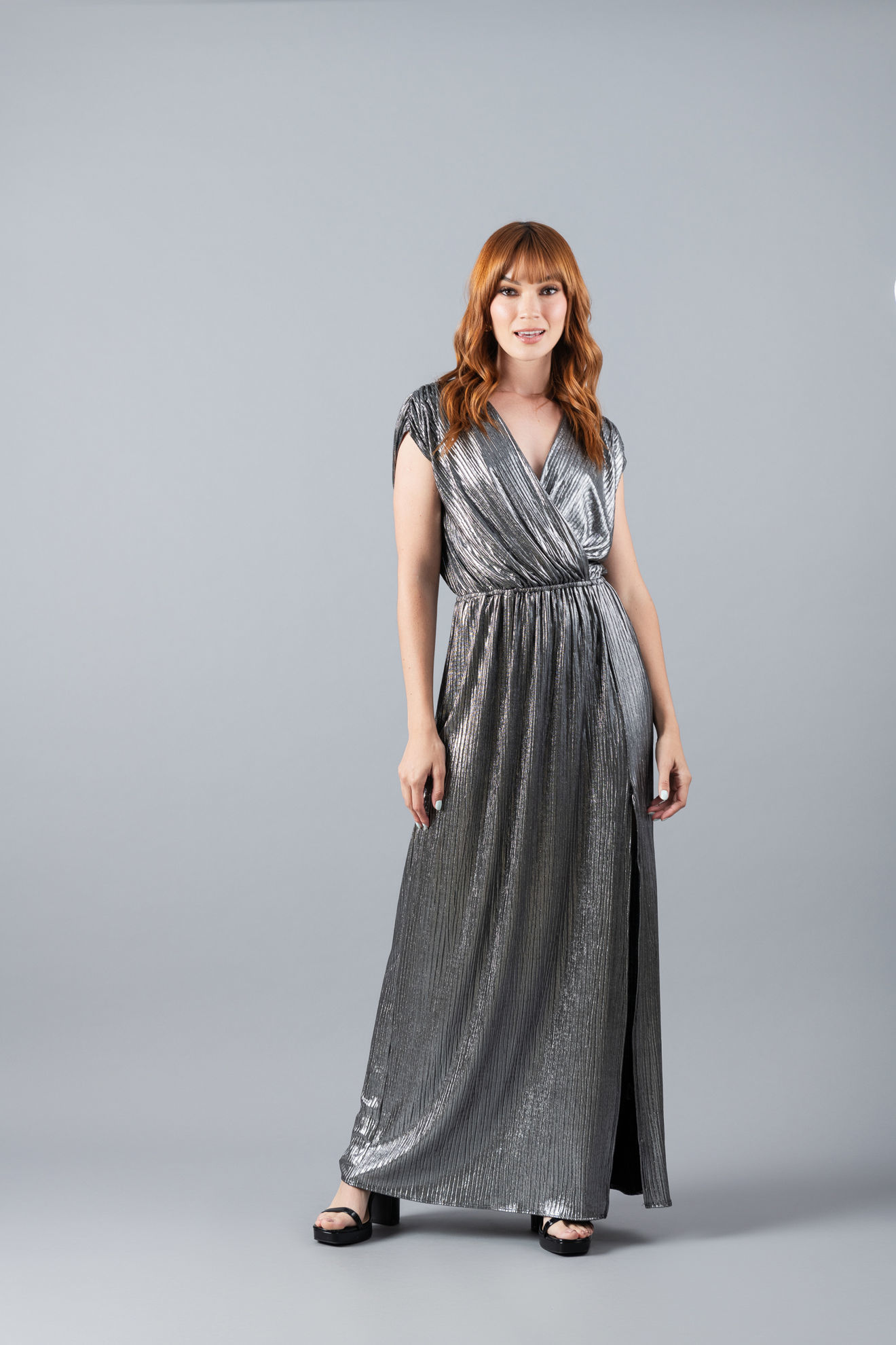Vestido Metalico Cuello V, Abertura Falda (Exclusivo Pagina)