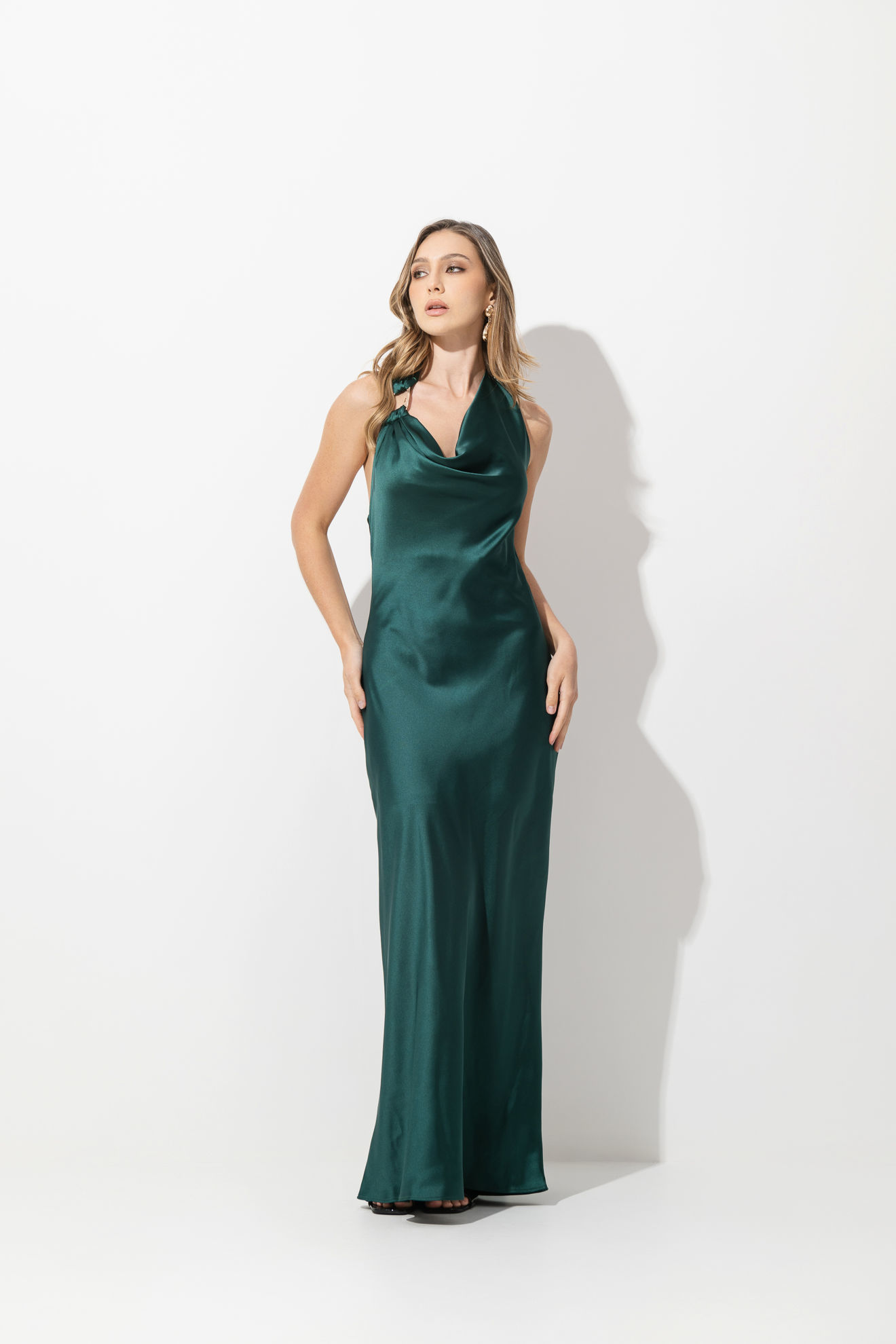 Vestido En Satin Cuello Halter Accesorio Hebilla Dorada