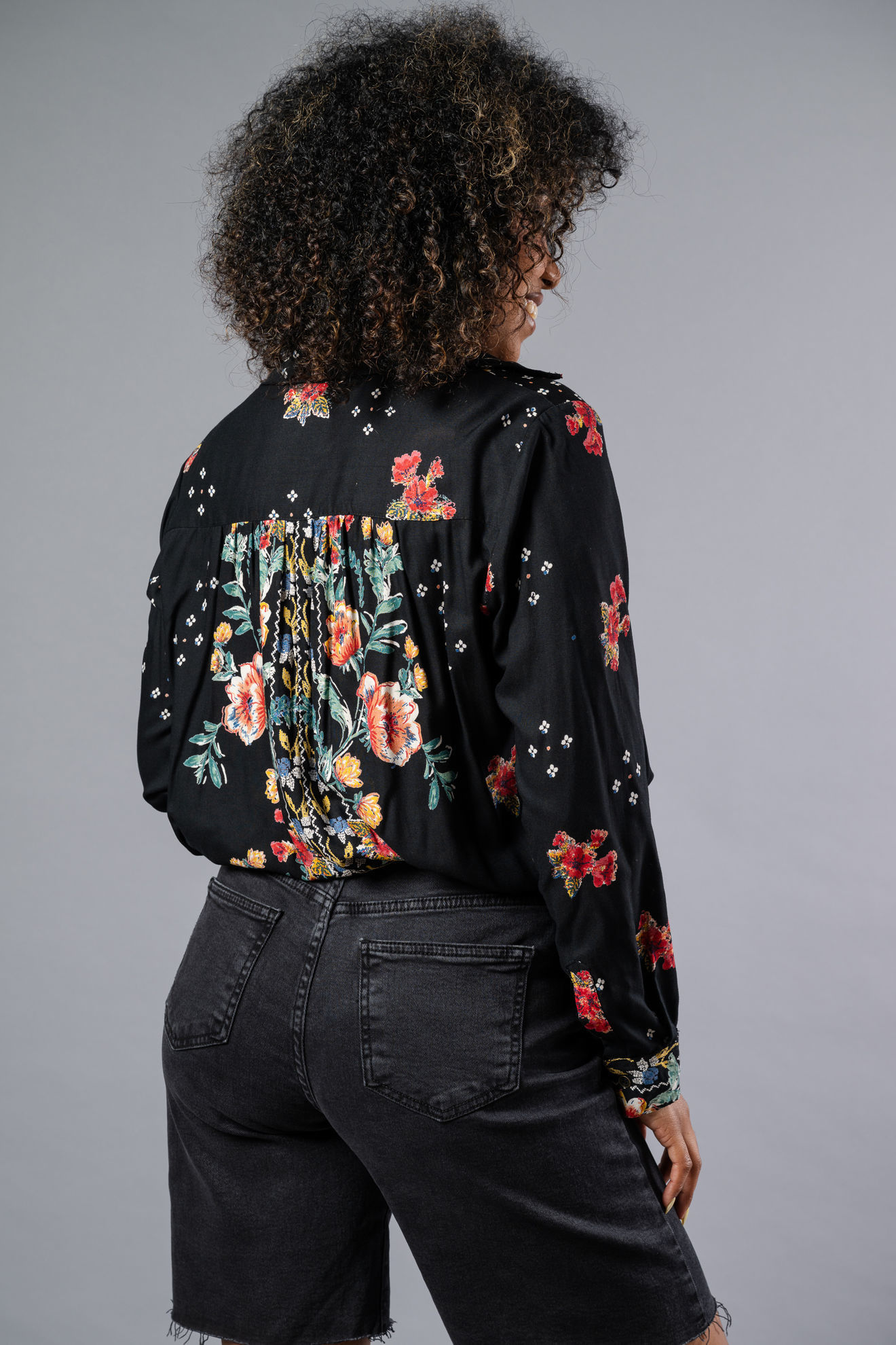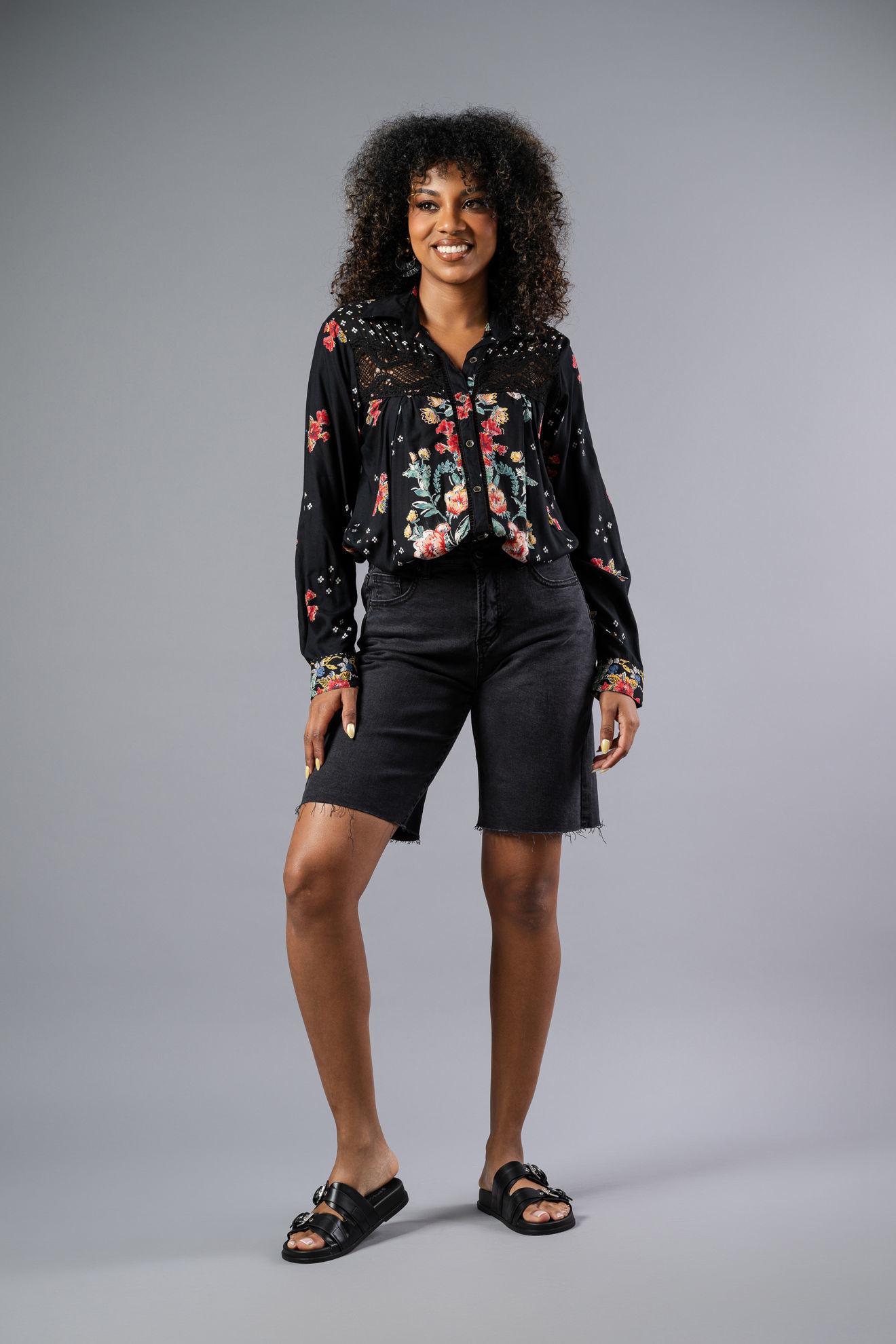Blusa En Rayon Floral Con Encaje Manga Larga