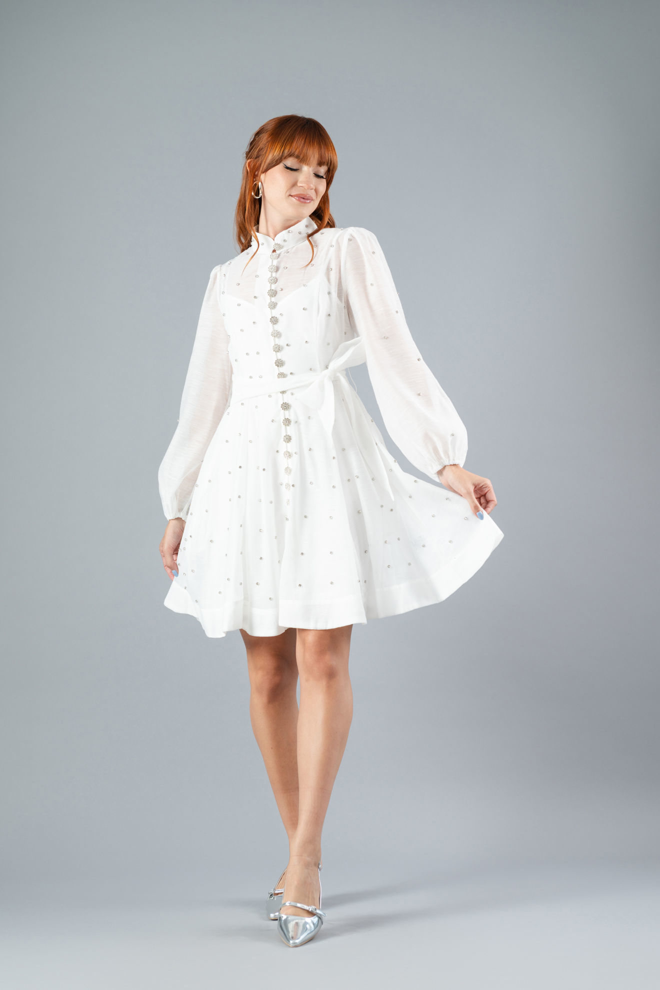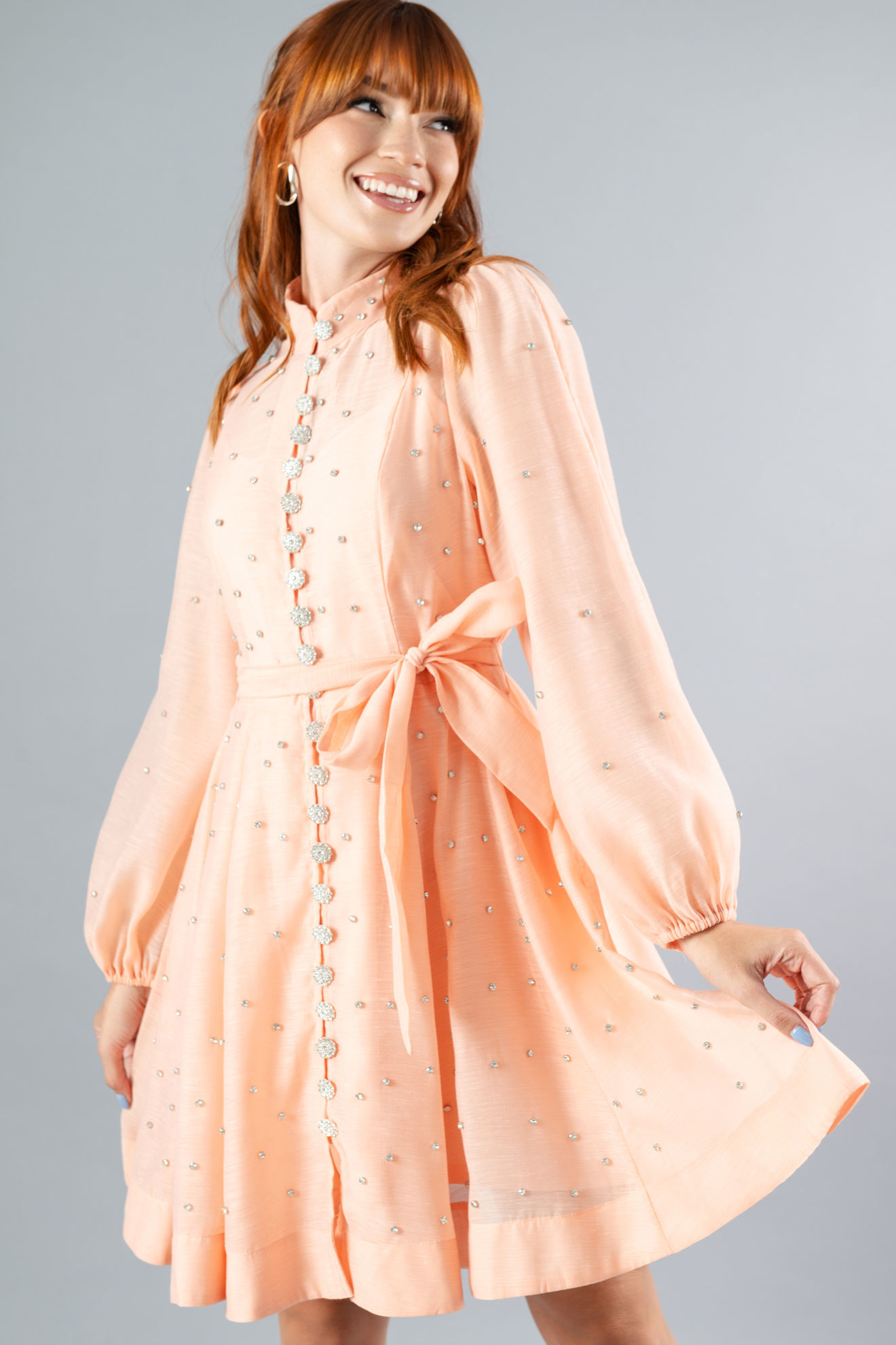 Vestido Manga Larga Cuello Alto, Botones Decorados