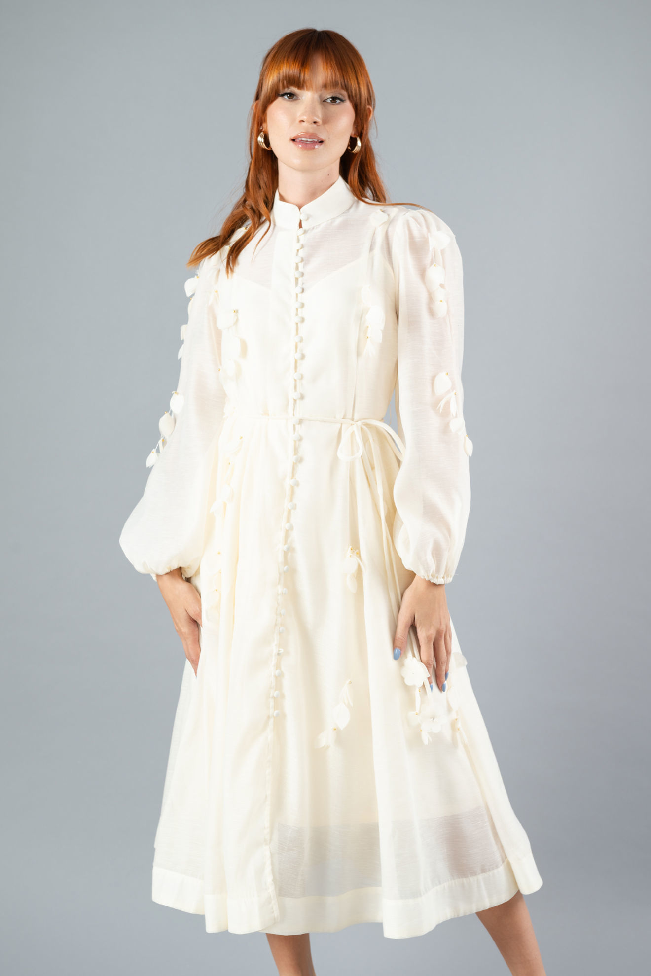 Vestido Manga Larga, Botones Forrados, Cuello Chino