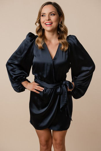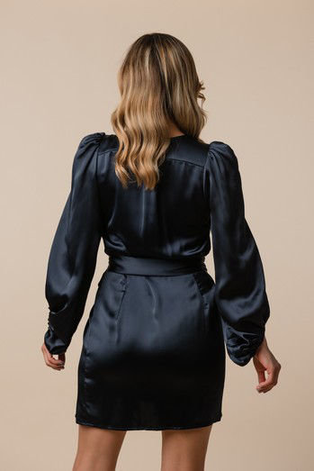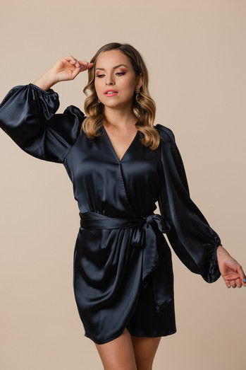 Vestido Cruzado Satín Corto, Manga Larga (Exclusivo Pagina)