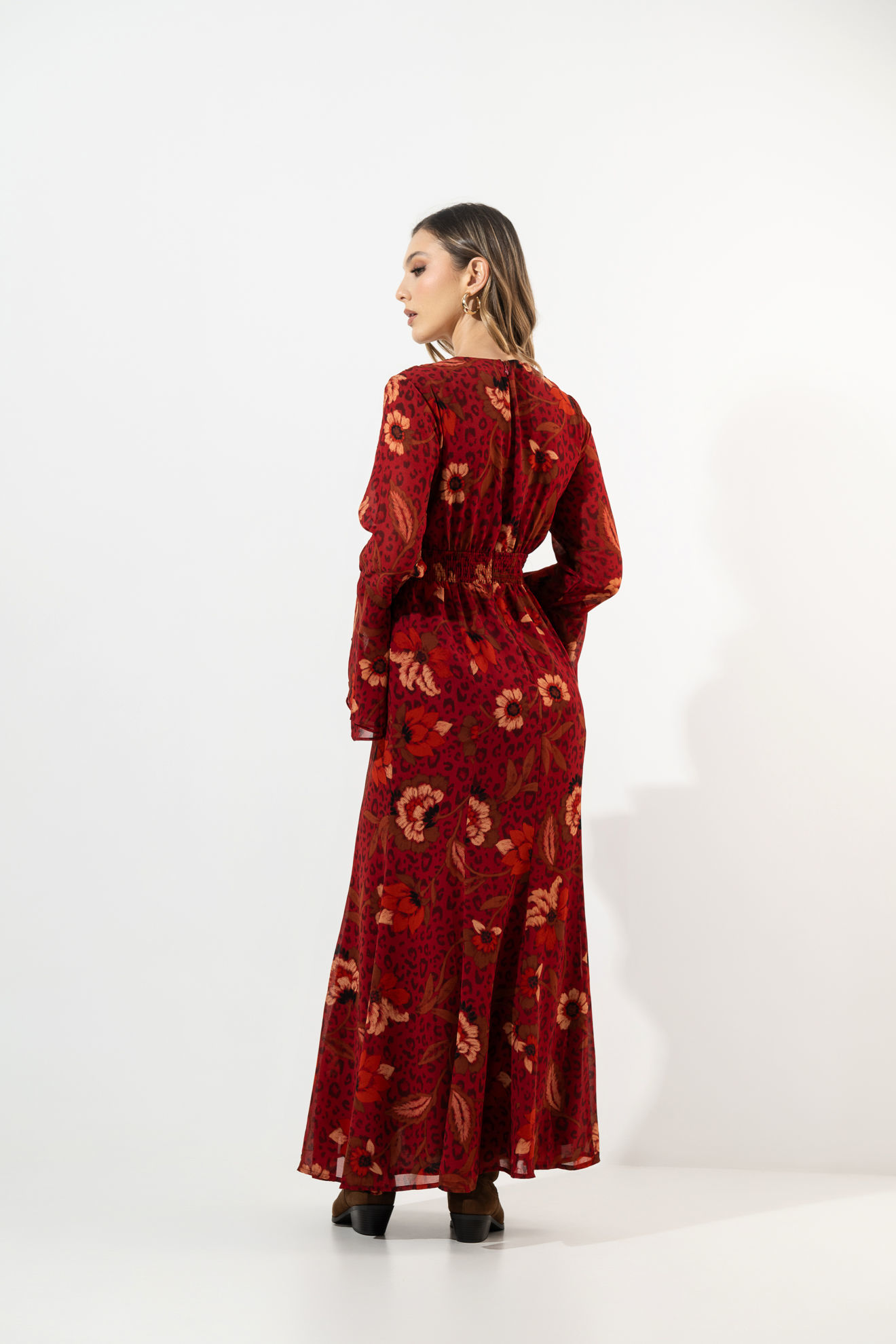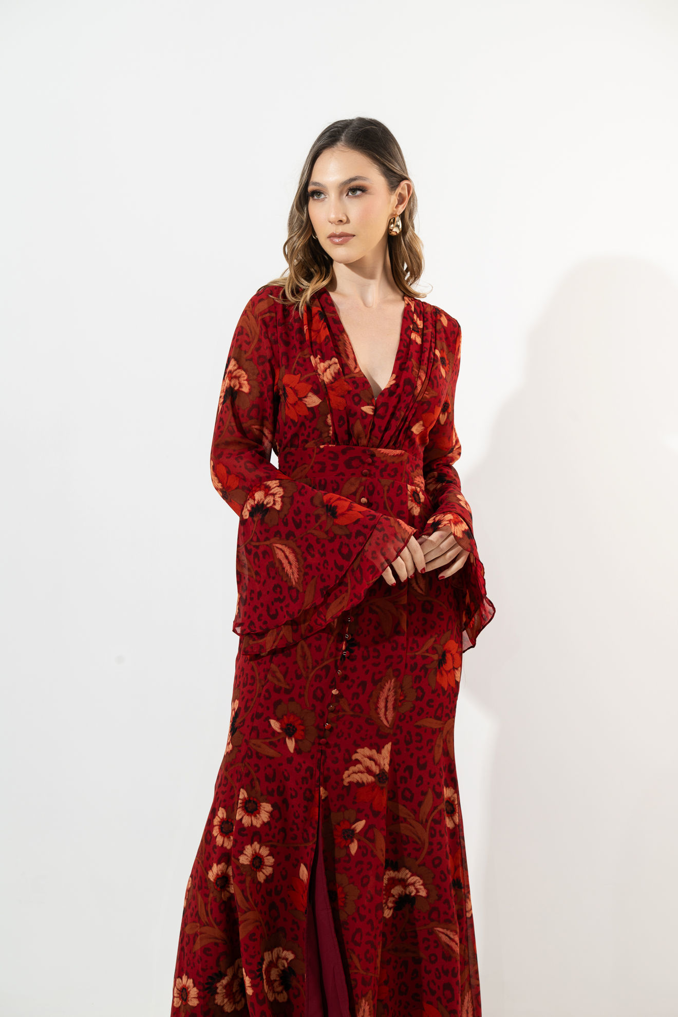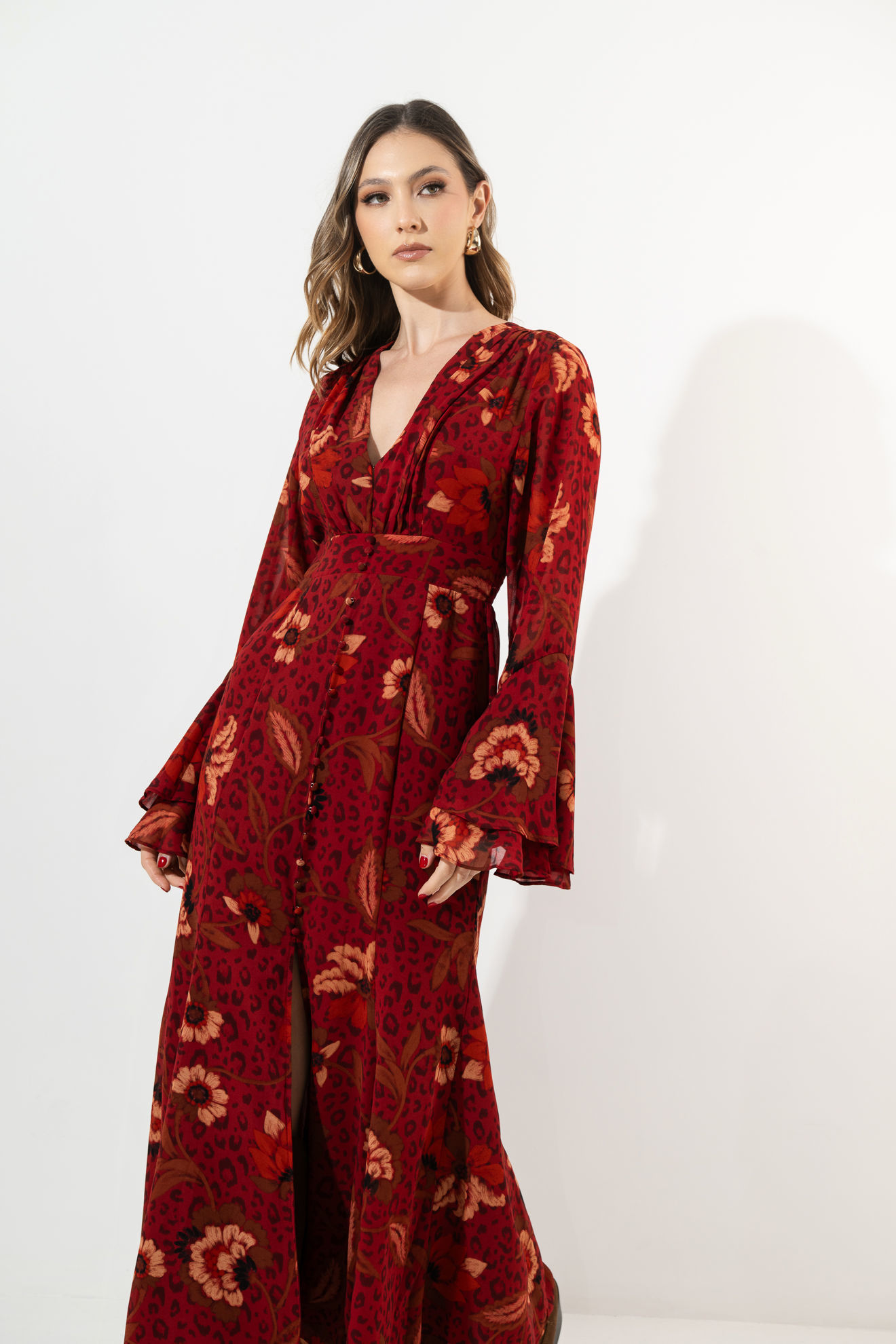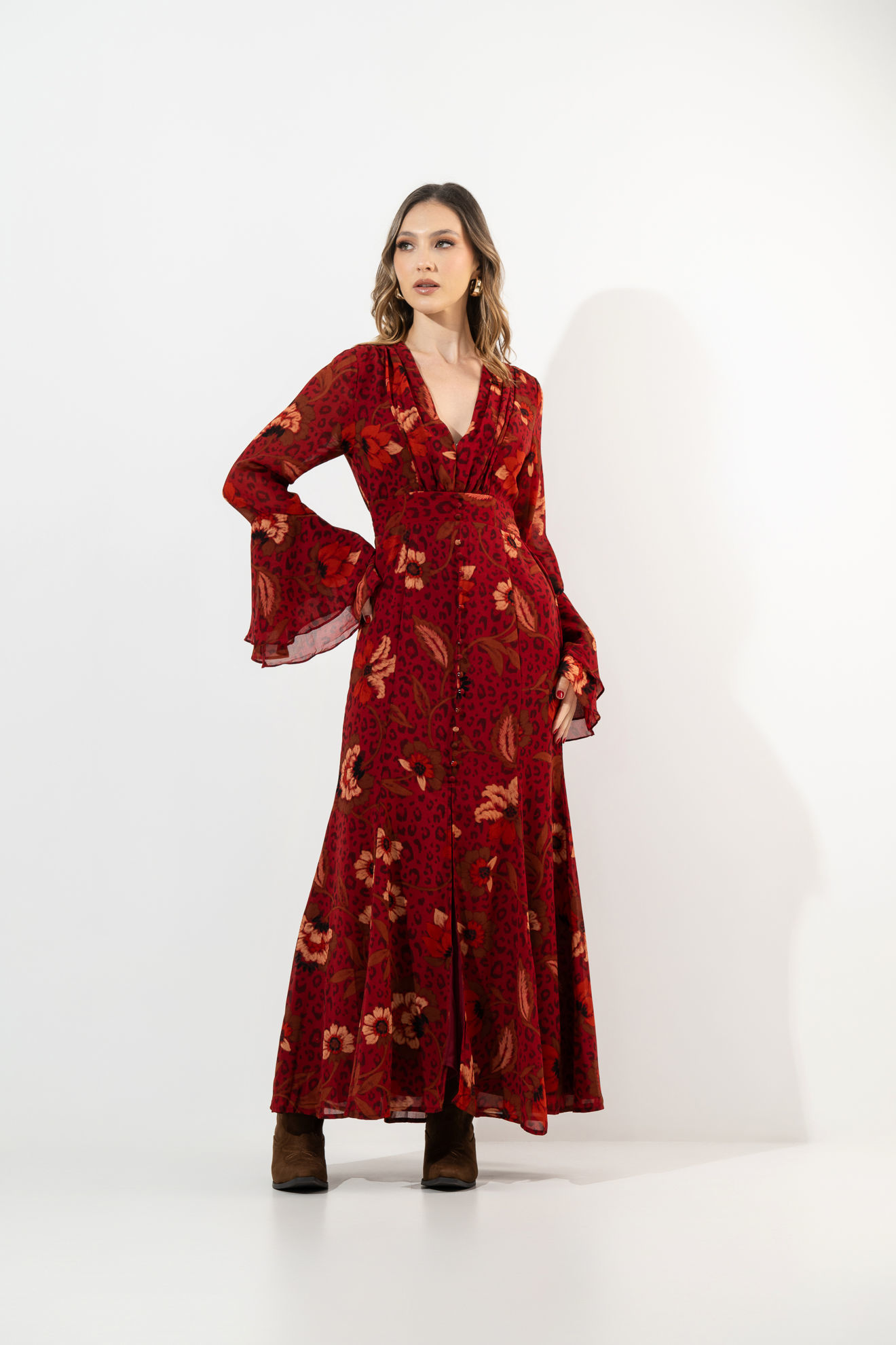 Vestido Estampado Mangas Largas Campana, Cuello V Botones Frente